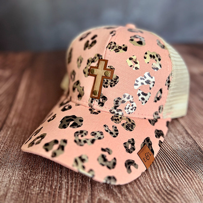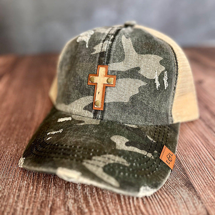 Make a bold statement of faith with our Cross Wood Veneer and Leather Patch Distressed Ponytail Hat. Crafted for those who seek to express their faith while staying stylish, this ponytail hat is the perfect addition to your wardrobe.