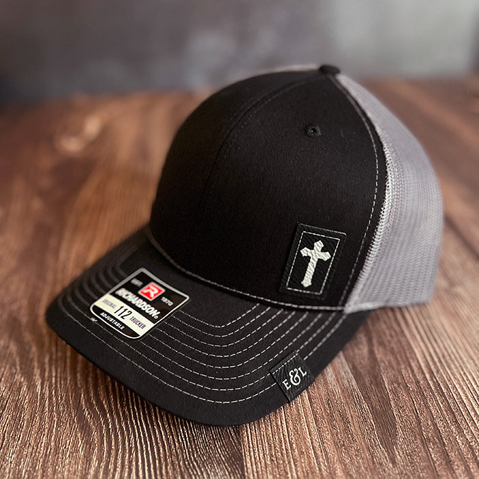 Introducing our Richardson 112 style trucker hat with a Christian Cross-Etched Patch. Unleash the power of faith and style with our exclusive hat featuring a striking vegan leather patch. This unique hat seamlessly blends contemporary fashion with a subtle expression of faith.
