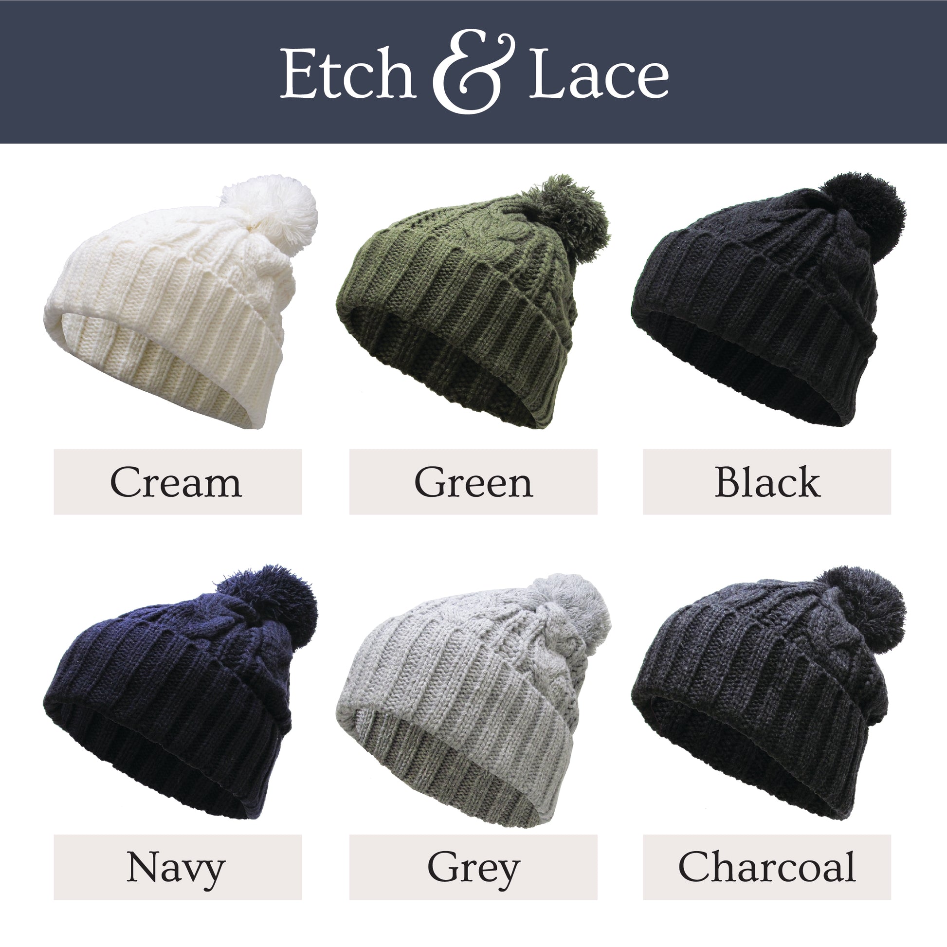Stay stylishly warm this winter with our personalized pom cable knit beanies! Make a statement while staying cozy or surprise a loved one with a personalized gift. Order now and embrace the cold weather with a touch of your unique personality.
