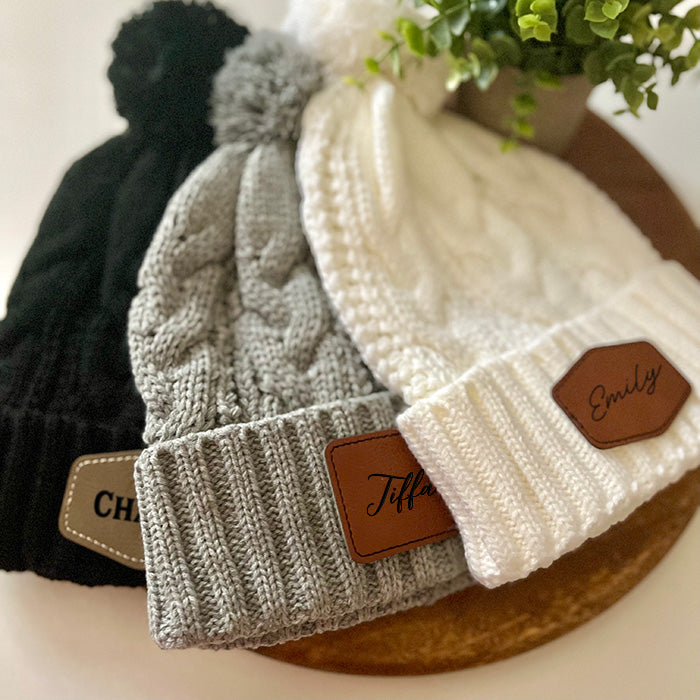 Experience winter warmth with a dash of personalized flair using our pom cable knit beanies! These beanies are not just cold weather essentials; they're also an opportunity to showcase your unique style. Featuring a charming pom and a customizable leather patch, these beanies are perfect for adding names, initials, or a special message. Stay snug while expressing your individuality in the chilliest of days.
