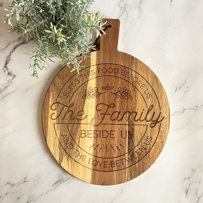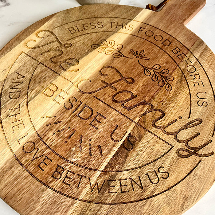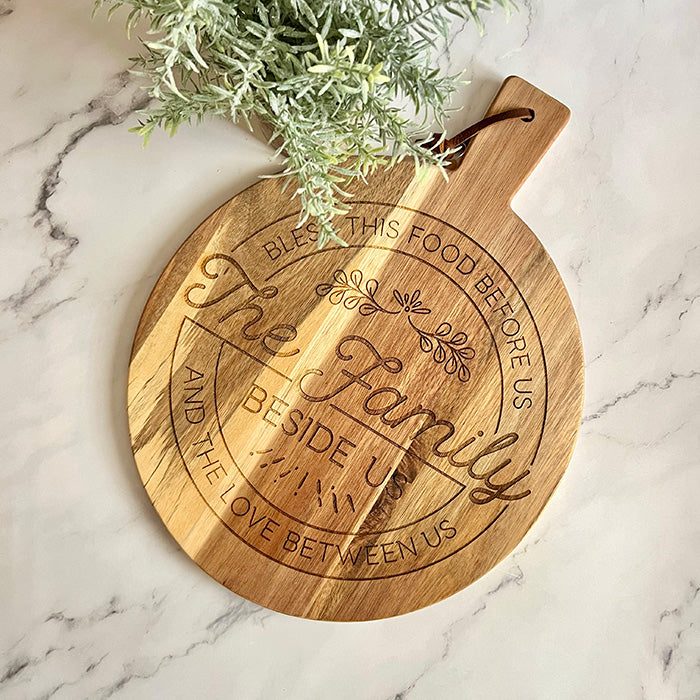 Bring warmth and meaning to your table with our limited edition round cutting board with handle, engraved with the heartfelt prayer: