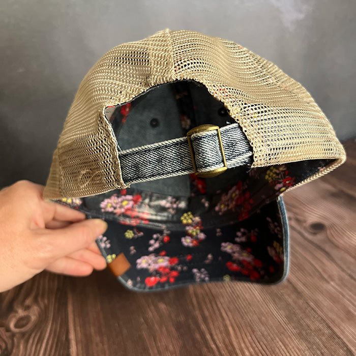Elevate your style with our Infinity Her Women's Denim Mesh-Back Cap, featuring charming floral fabric details under the rim and a unique rawhide leatherette patch showcasing a beautiful lavender fields design. This cap combines comfort, style, and a touch of nature, making it the perfect accessory for any casual outing.