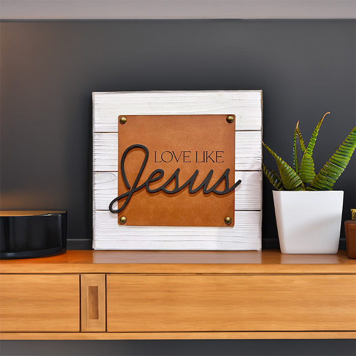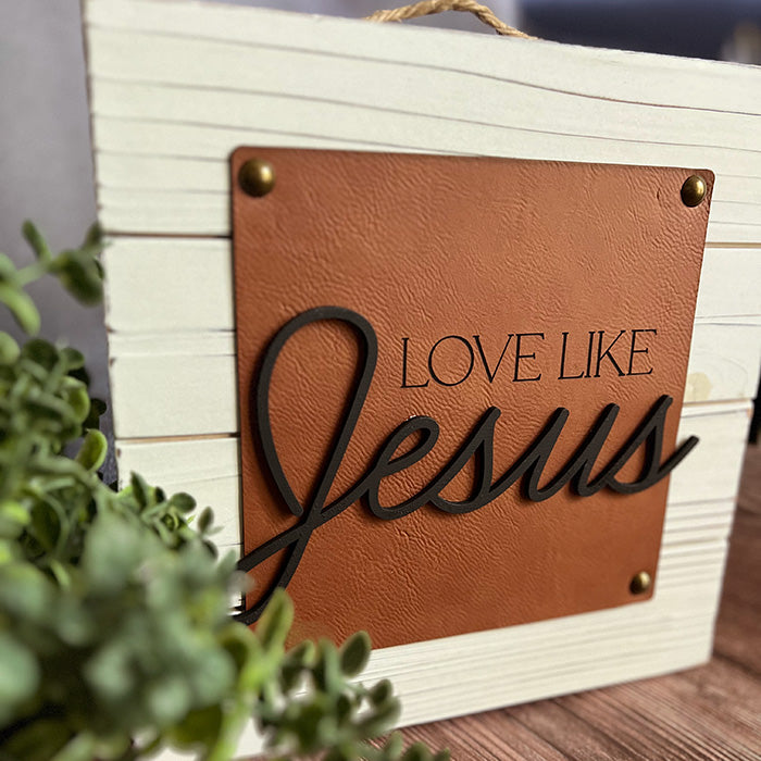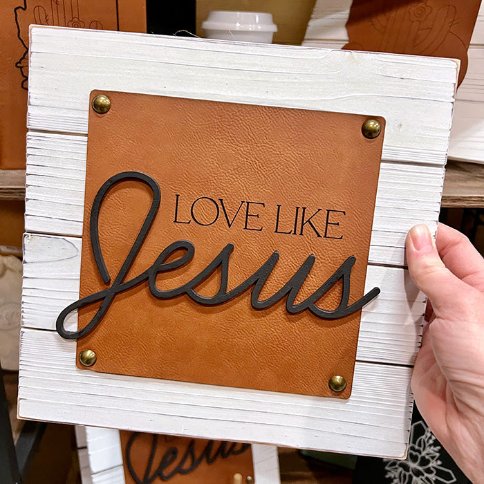 Elevate your space with our Love Like Jesus Shiplap Wood Sign, a harmonious blend of rustic charm and modern elegance. This 10 x 10" sign features a shiplap wood background seamlessly layered with leatherette, accented by bronze tacks and the word "Jesus" precisely leveled above the leatherette for a stunning and meaningful display.