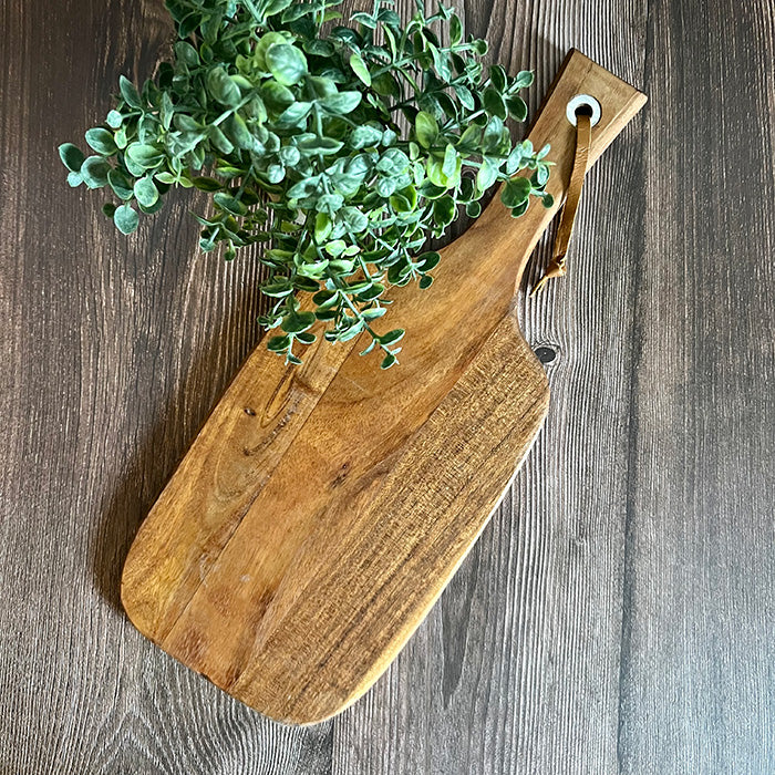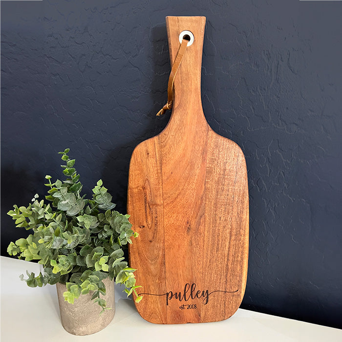 Introducing an exquisite culinary masterpiece - a personalized laser-etched cutting board designed to elevate your cooking experience to unparalleled heights. Crafted from the finest hardwood, this rounded paddle board-style cutting board seamlessly combines artistry with functionality. The natural grain of the hardwood lends an organic elegance to your kitchen, while the rounded paddle board shape offers versatility in slicing, dicing, and chopping.