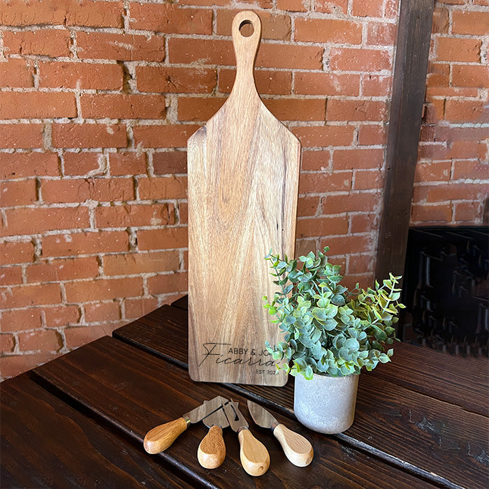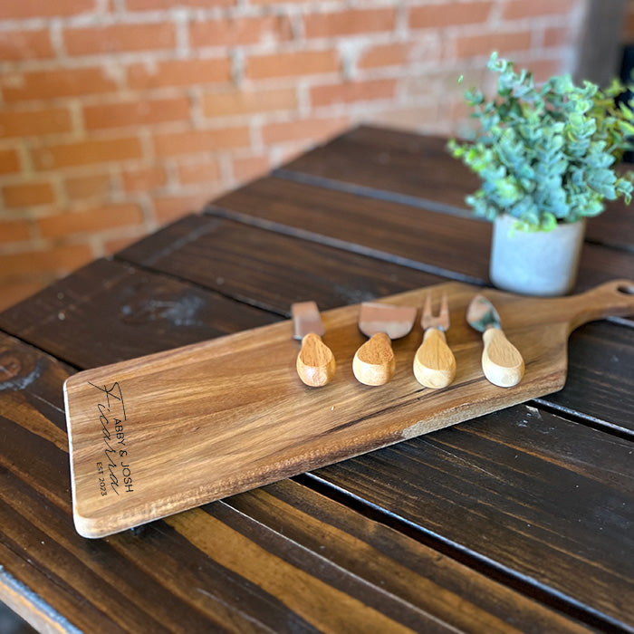 Elevate your culinary experience and gatherings with our versatile Personalized Acacia Wood Cutting Board Set. This exquisite 19.5" x 6" acacia wood board isn't just a cutting board; it doubles as a charming charcuterie board, perfect for entertaining. Crafted to enhance your kitchen decor, this set can be personalized to make it a thoughtful and unique gift. It comes paired with a cheese knife set, making it an ideal choice for weddings, housewarmings, anniversaries, realtor gifts and more.