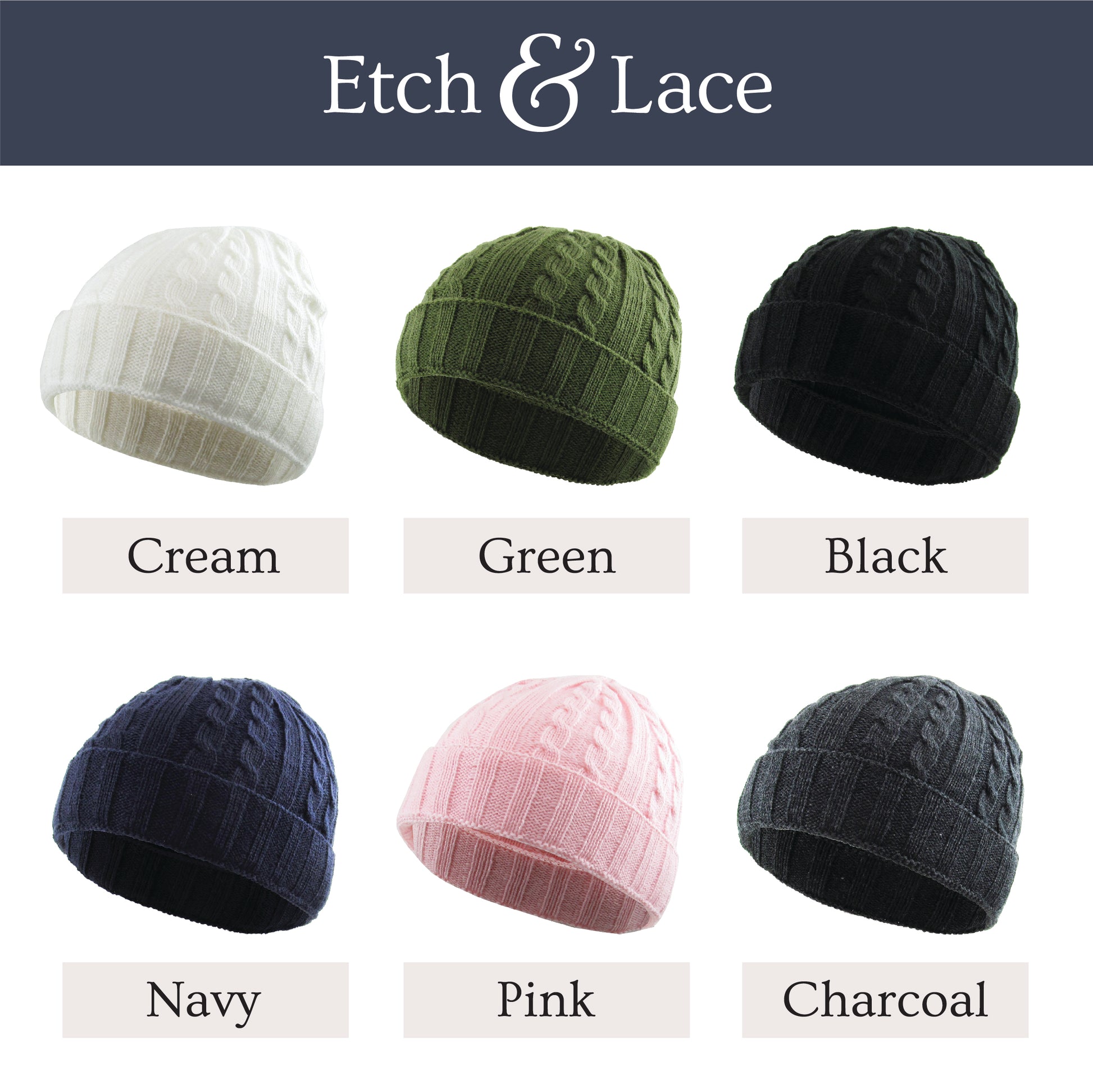 Upon placing your order, kindly send us a message with the text or initials you'd like for your personalized leather patch, along with your font choice. We'll ensure your cable knit beanie reflects your distinctive style!