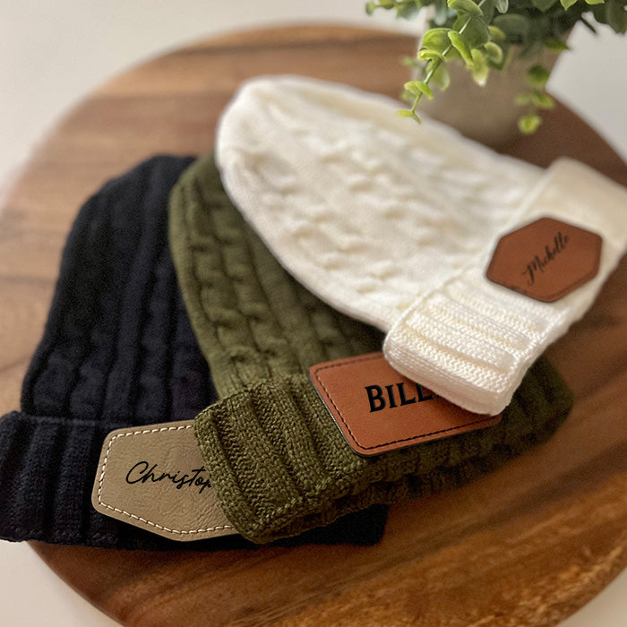 Create your signature winter style with our personalized leather patch knit beanies! Stand out in the cold while showcasing your individuality or surprise someone special with a thoughtful, custom-made gift. Order now and stay cozy while making your mark on winter fashion.
