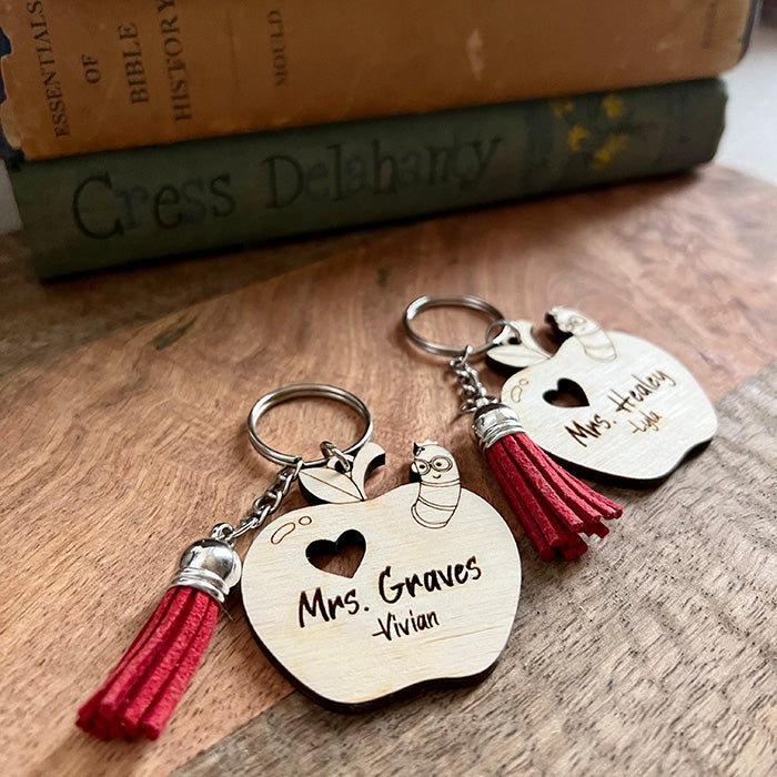 Looking for a thoughtful and memorable gift for that special teacher? This adorable apple-shaped wooden keychain, complete with a little worm detail, is the perfect way to say “thank you” in a sweet and creative way.