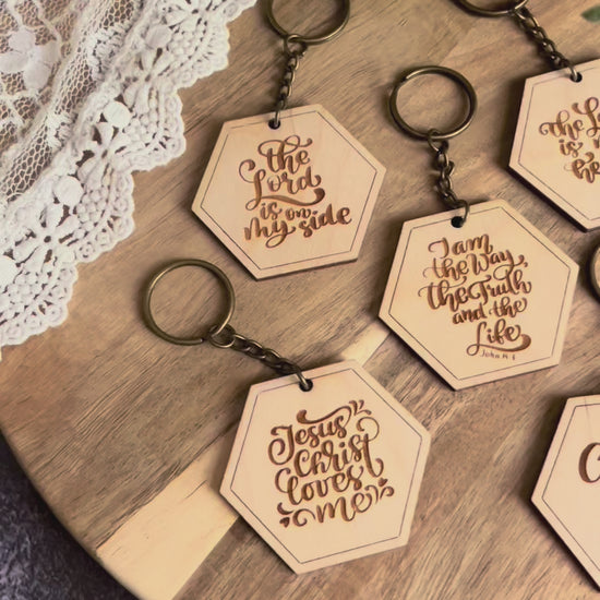 Carry the Word with you wherever you go with our Wooden Scripture & Faith-Inspired Keychains.