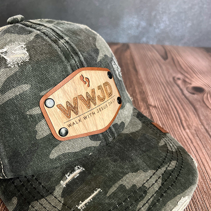 Elevate your everyday look with our exclusive WWJD Wood Veneer and Leather Patch Camo Ponytail Hat. Infusing faith with fashion, this hat is tailored for those who wish to Walk with Jesus Daily in every moment.